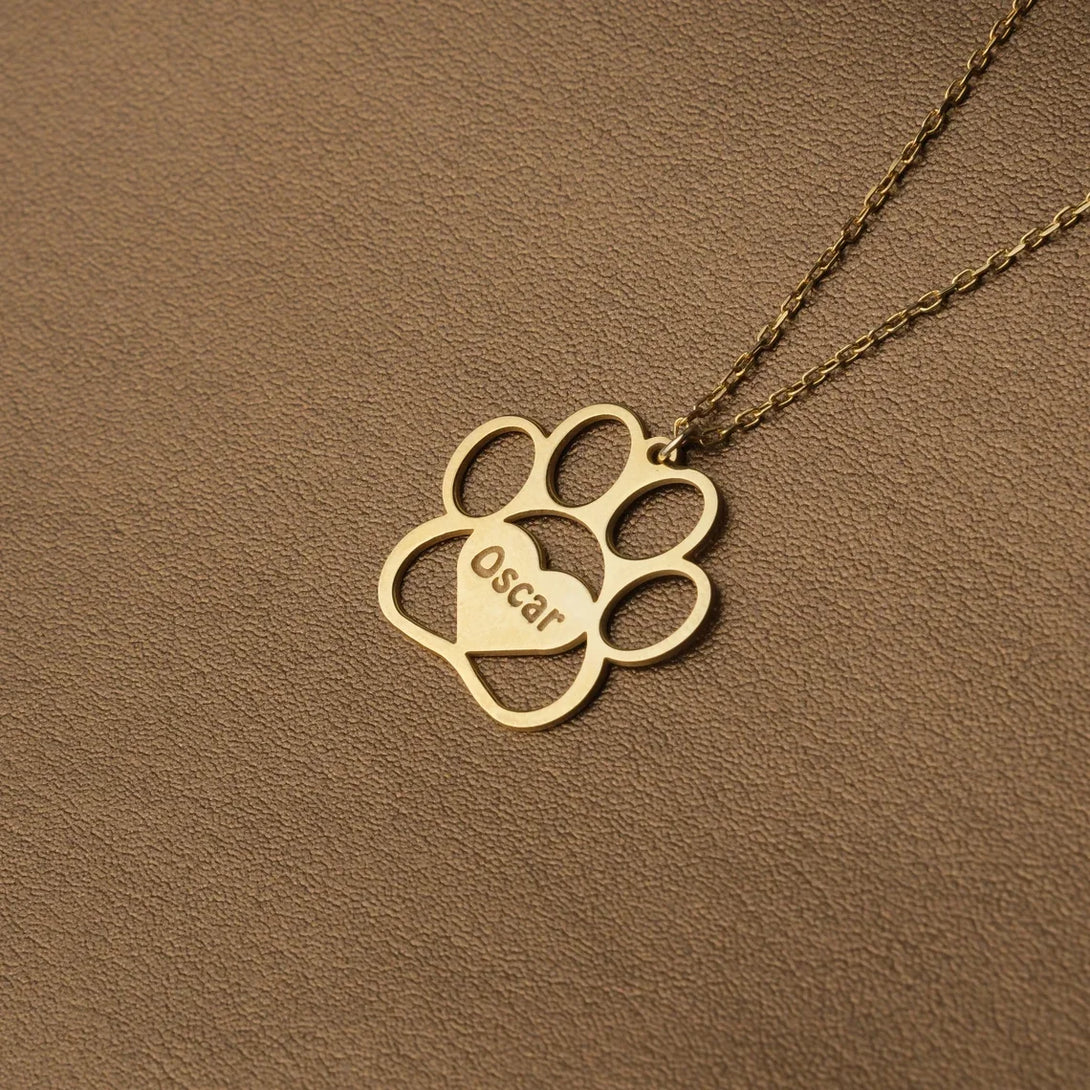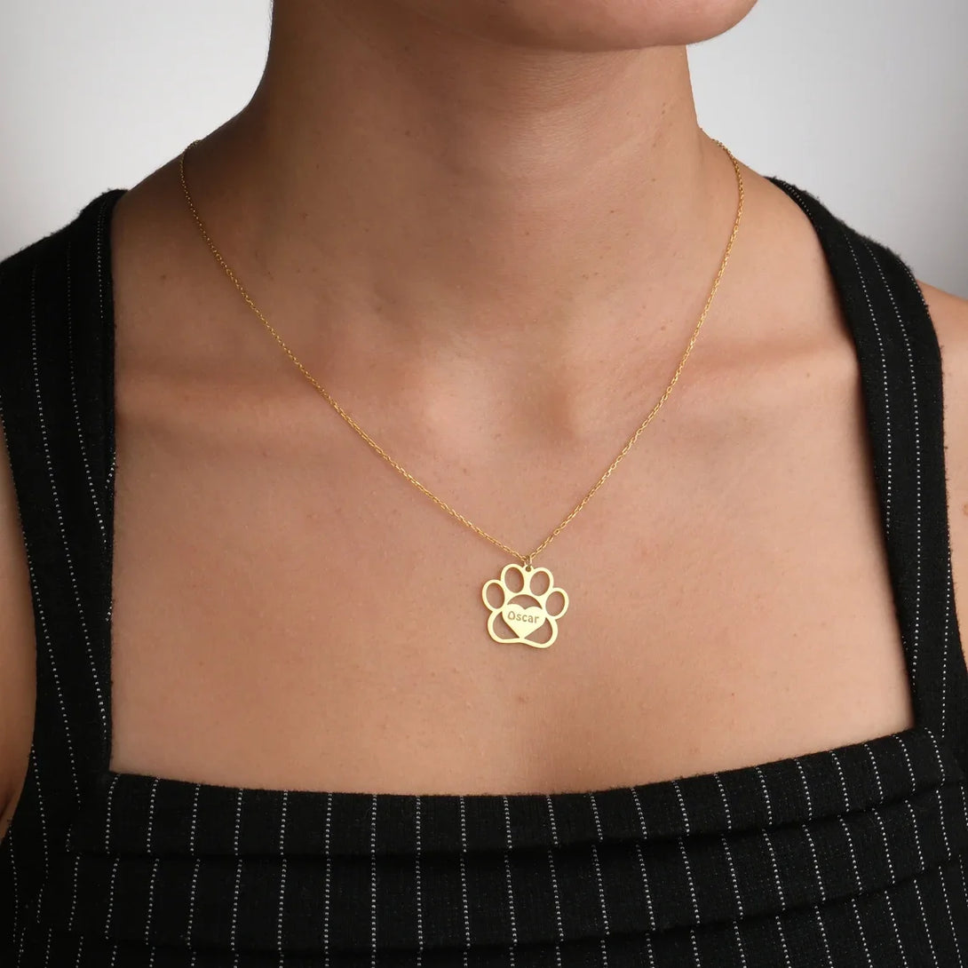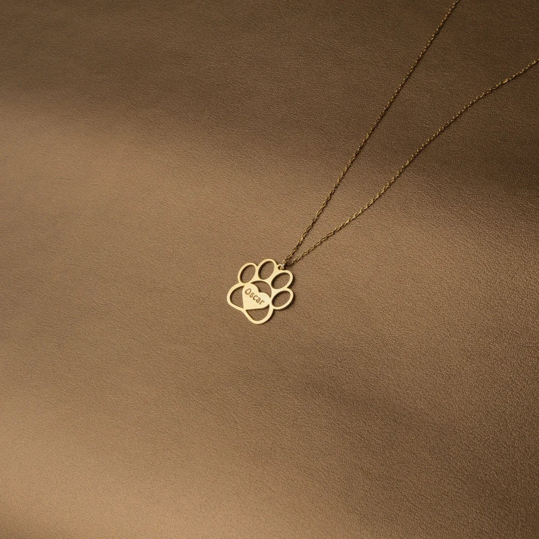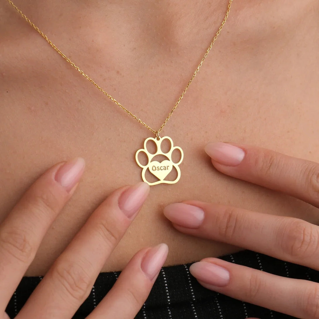 - Lindo colar com uma patinha e o nome do pet escrito no meio, permitindo que você carregue seu pet sempre perto do coração.