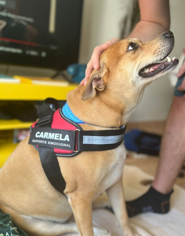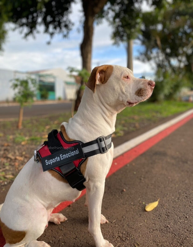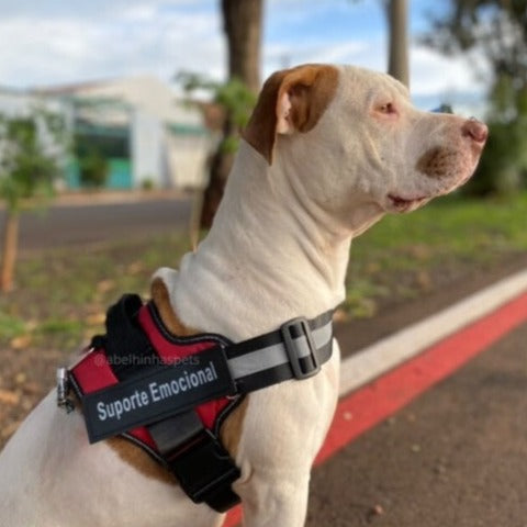 Este é um peitoral de Suporte Emocional, pode ser adicionado o nome do cão juntamente com a escrita suporte emocional ou emotional support, para isto, deverá ser adicionado tal informação no campo de personalização.