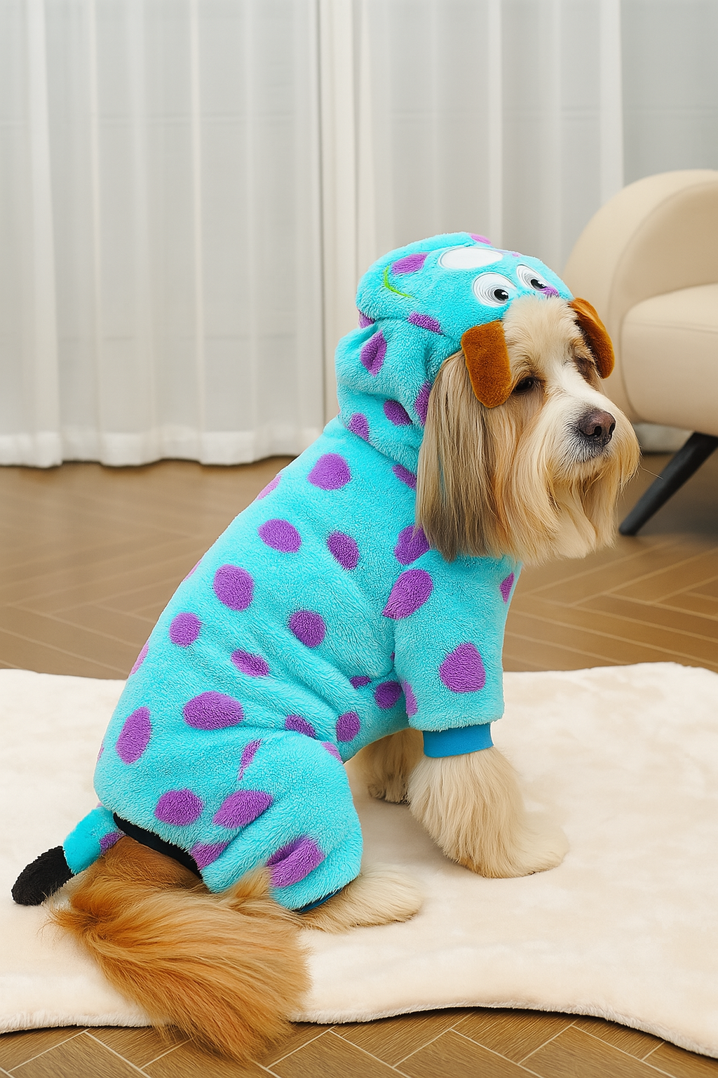 Transforme seu pet em um verdadeiro monstrinho fofo com a Fantasia Sulley do Monstros S.A.! Feita em lã macia, essa roupinha além de manter seu doguinho ou gatinho protegido do frio, deixa ele pronto para arrasar nas fotos com muito estilo e diversão! 🐾💙